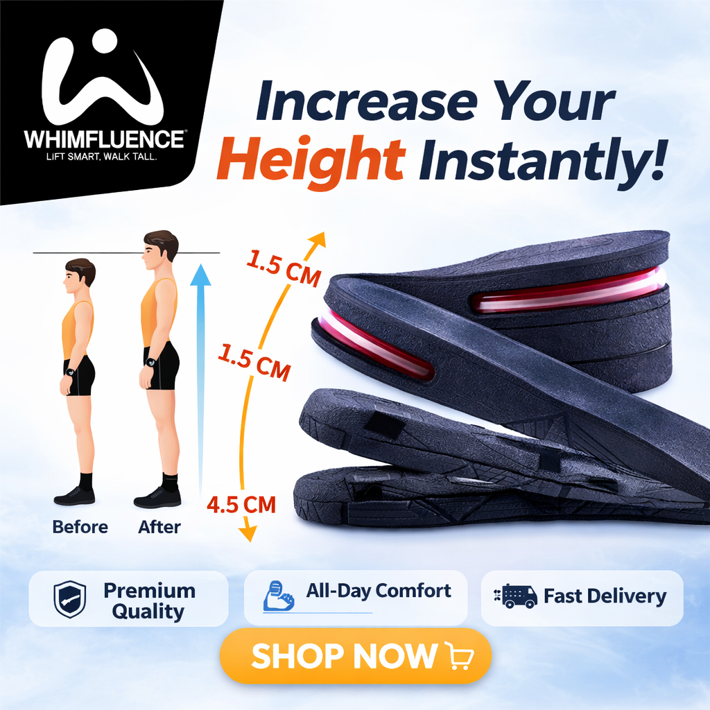 Step into confidence with our premium height increase insoles, crafted for comfort, support, and a natural boost. Loved by customers across Pakistan, Whimfluence offers reliable quality, fast delivery, and unbeatable value. 🚀